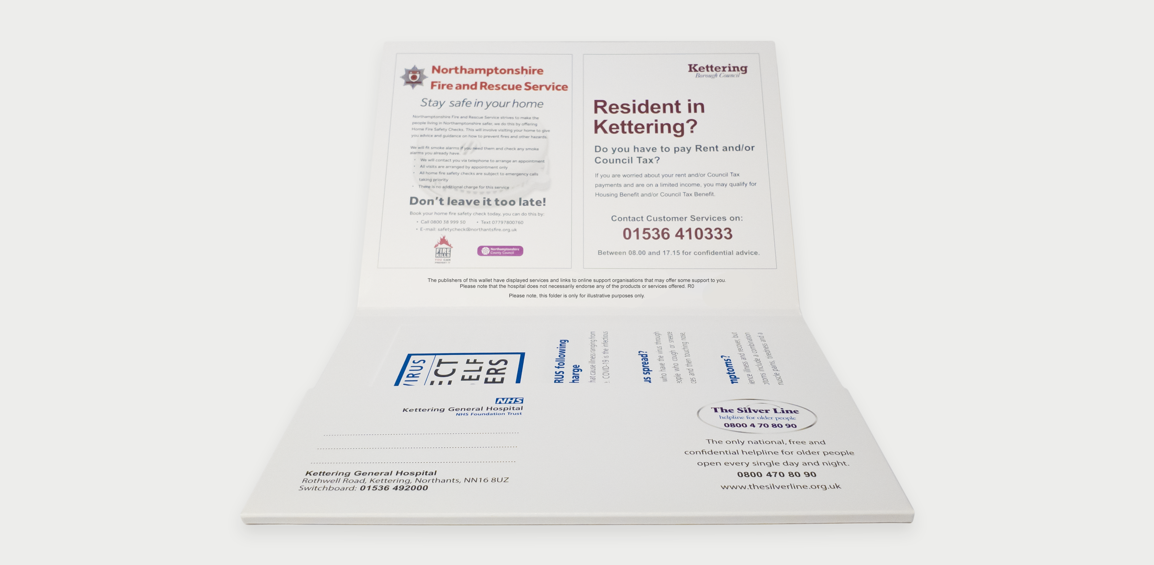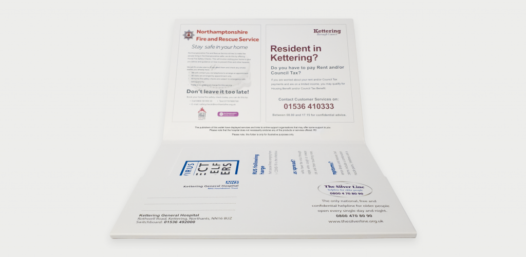 The packs and its leaflets can be provided at no cost to the NHS and to patients by using key and relevant sponsors or at a competitive cost subject to quantities. Whichever option the folders are designed and delivered to your exact requirement to fit with your patient facing identity.